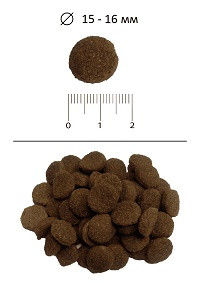 Дегидрированное мясо домашней птицы (курица, индейка) (26%), пшеница, цельная кукуруза, отруби, свиной жир, сушёная мякоть свеклы, гидролизованный белок, гидролизованные субпродукты, дрожжи - источник манноолигосахаридов (MOS), витаминно-минеральный комплекс (витамины: А, D3, Е, холин хлорид, бетаин, В3, В5, В2, В1, В6, фолиевая кислота, В12, калий, цинк, железо, марганец, медь, йод, селен), сушёные яблоки, антиоксидант.