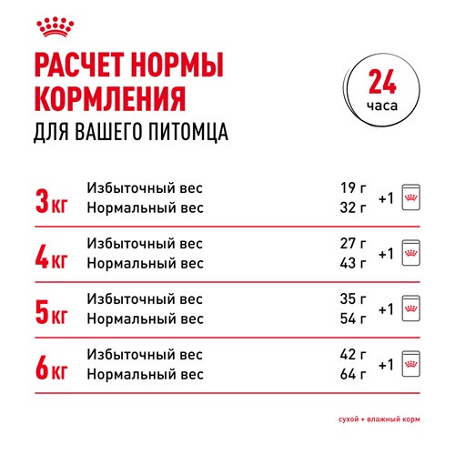 Если Вы выбрали для вашей кошки смешанное питание, следуйте нашим рекомендациям в рационных таблицах: это позволит смешивать сухой и влажный продукт в пропорциях, оптимальных для здоровья животного. Доказанные результаты: более 90% кошек достигли более здорового веса в течение 8 недель при потреблении рационов Royal Canin Light Weight Care (сухой и влажный корм).