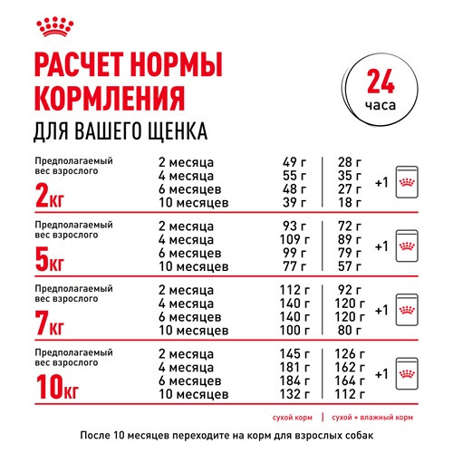В возрасте 10 месяцев период роста подойдет к завершению, и потребности вашего щенка в питательных веществах изменятся. Ему будет необходим другой рацион, разработанный специально для взрослых собак мелких размеров. В этом возрасте вы сможете перевести своего щенка на корм Royal Canin Mini Adult.